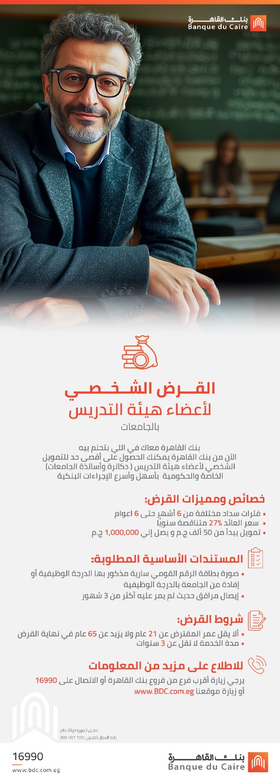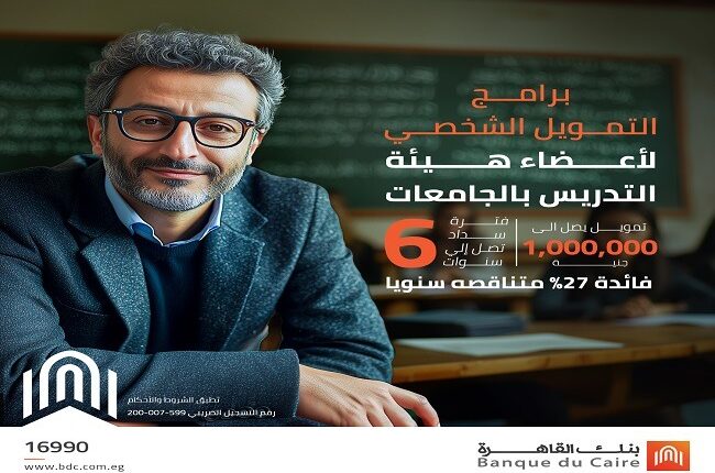 أعلن بنك القاهرة عن توفير برنامج تمويل شخصي مخصص لأعضاء هيئة التدريس بالجامعات بتمويل يصل إلى مليون جنيه، وفترة سداد حتى 6 سنوات بفائدة تبدأ من27% متناقصة سنوياً.